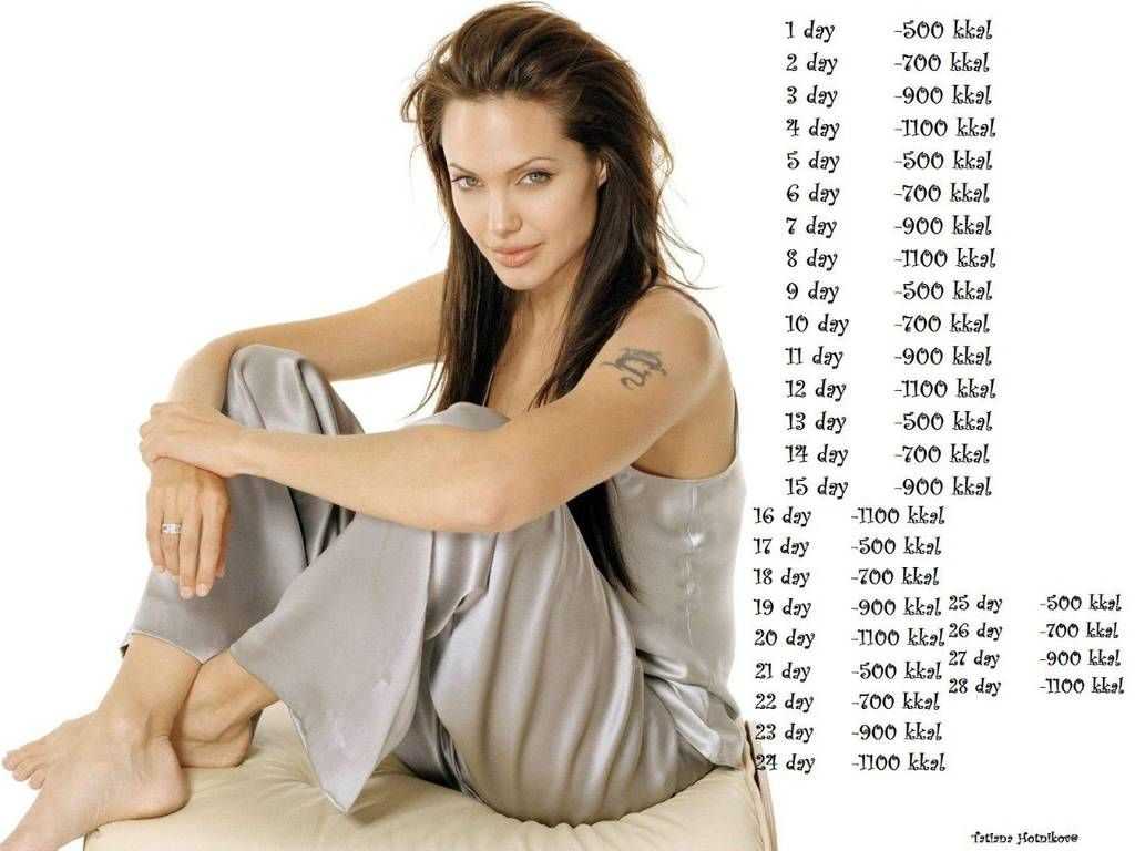 Суточный объем килокалорий, который употребляет Анджелина Джоли, составляет 2 400 ккал. Если вы ведете малоподвижный образ жизни, то этого количества может быть многовато для поддержания фигуры в норме.