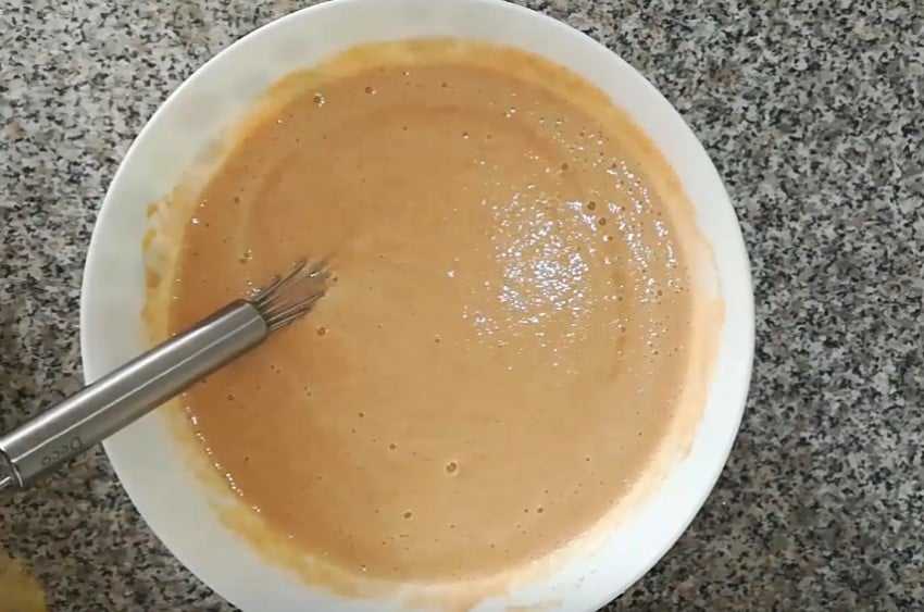- Медленно влить воду, помешивая содержимое венчиком. Должна получиться однородная тягучая масса без комочков. Если тесто вышло слишком густым, можно влить ещё 0,5 стакана воды.