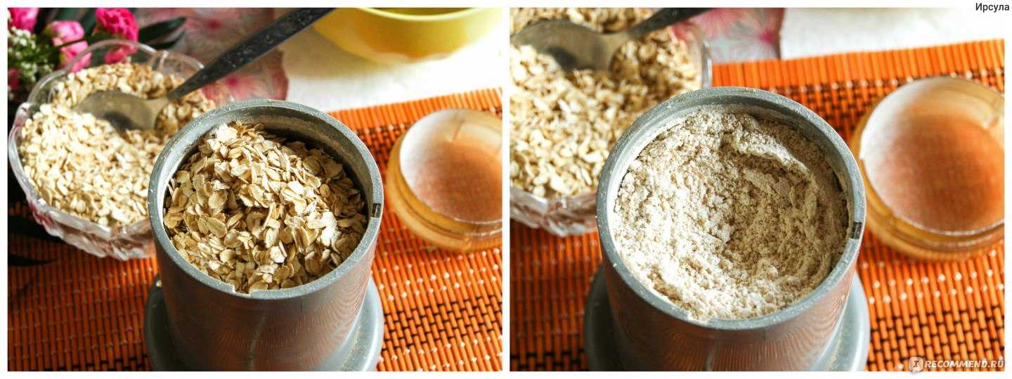 Овсяные хлопья предварительно нужно смолоть при помощи блендера или кофемолки, но не до состояния муки, а как на фото. Это необходимо проделать для лучшего пищеварения, а также для приятной консистенции теста.