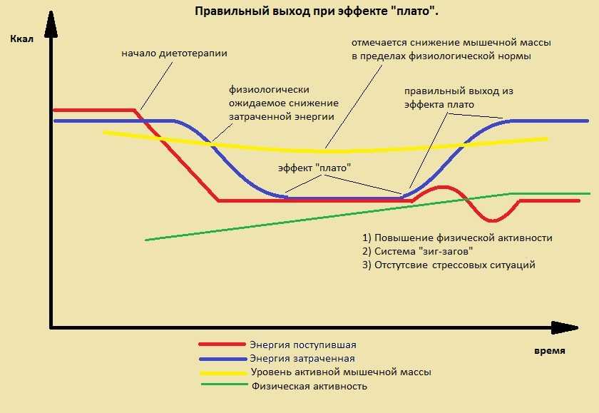 Во время диеты, даже самой строгой и ограниченной, стремительное похудение отмечается только в первые дни. Объясняется это тем, что из организма выводится лишняя жидкость и белок. В дальнейшем вес будет уходить, но уже не так быстро. Такое медленное снижение веса объясняется тем, что организм начинает защищать подкожную прослойку, и вес замораживается. Этот момент в диете называется плато.