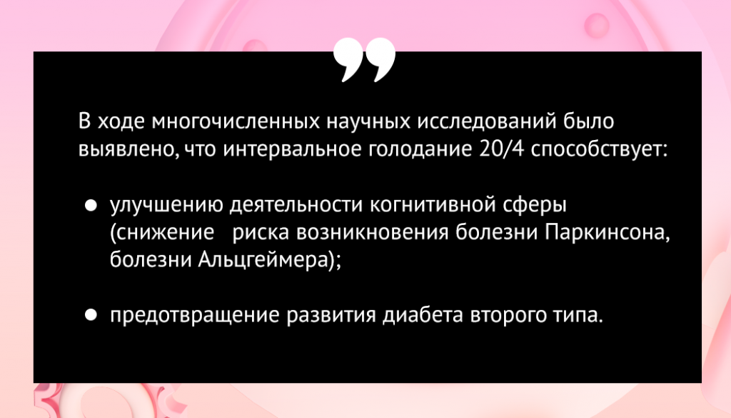 В ходе многочисленных научных исследований было выявлено, что интервальное голодание 20/4 способствует: