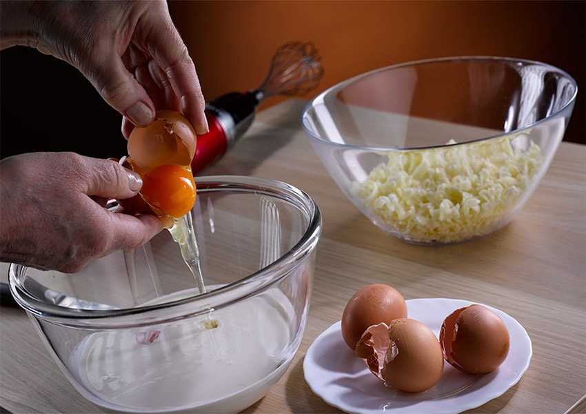 - Разделяем яйца: белки переливаем в отдельную посуду — они нам еще понадобятся.
