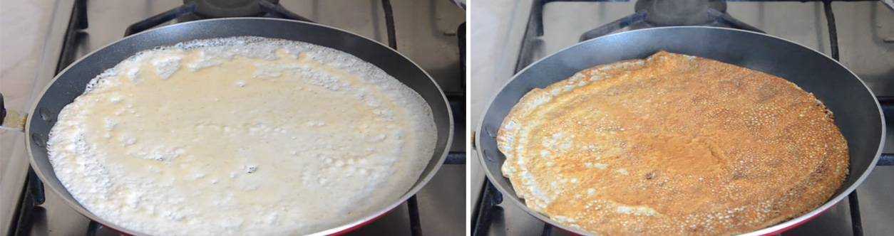 - На прогретую сковороду вылить рабочую массу, разровнять силиконовой лопаточкой или ложкой. Слой нужен не слишком тонкий.