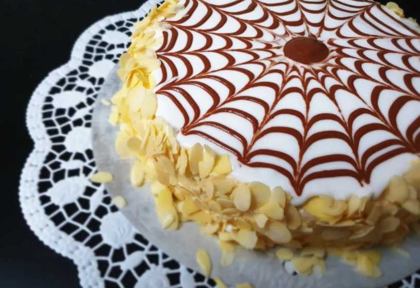 - Смазать коржи кремом, добавляя в прослойку миндальные лепестки. Выровнять торт лопаткой. По бокам украсить миндальными лепестками. Не забудьте про черно-белый узор, который неизменно присутствует на верхнем слое торта «Эстерхази». Для этого необходимо растопить 20 г шоколада без сахара и с помощью кондитерского мешка нанести на верхний слой торта в виде спирали, формируя зубочисткой узор.