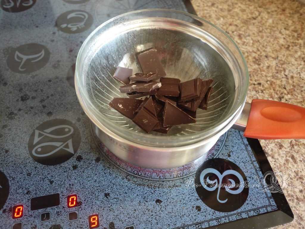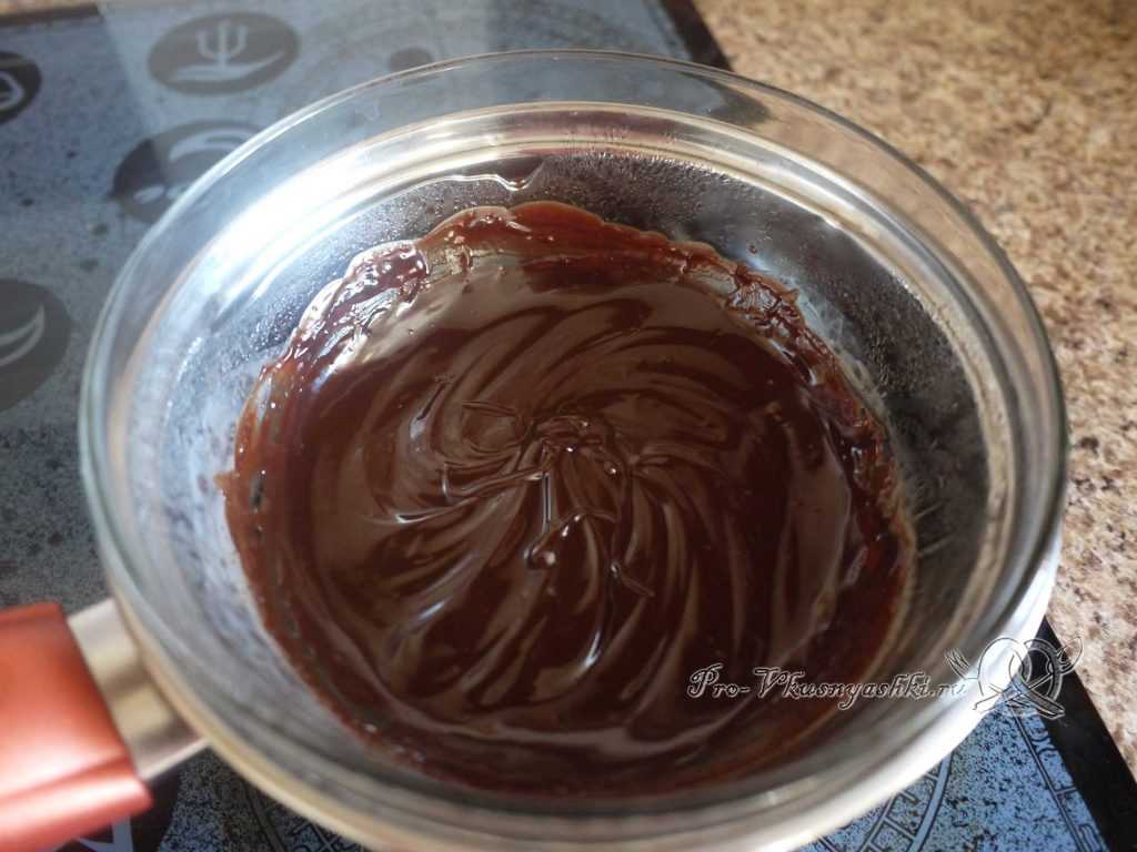 Плитку шоколада топим на водяной бане или в микроволновке (25-30 с при мощности 800 Вт). Поверхность посуды, в которую помещаете шоколад, должна быть идеально сухой, иначе продукт может расслоиться.