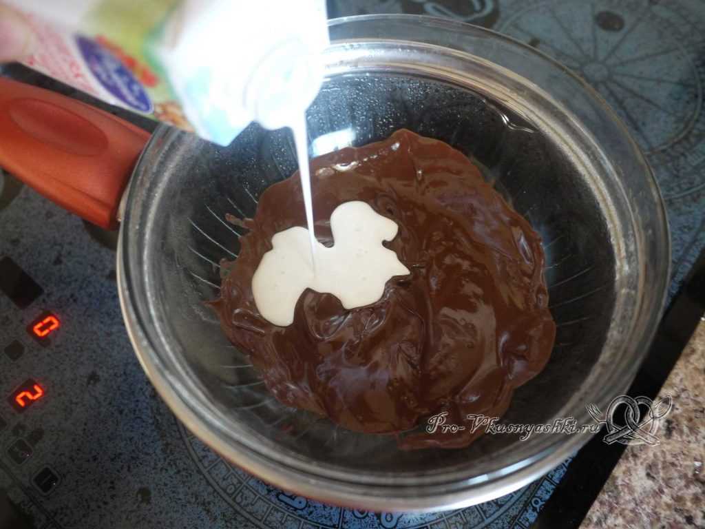 В жидкий какао продукт добавляем сливки (50 мл), затем перемешиваем ингредиенты до однородности.