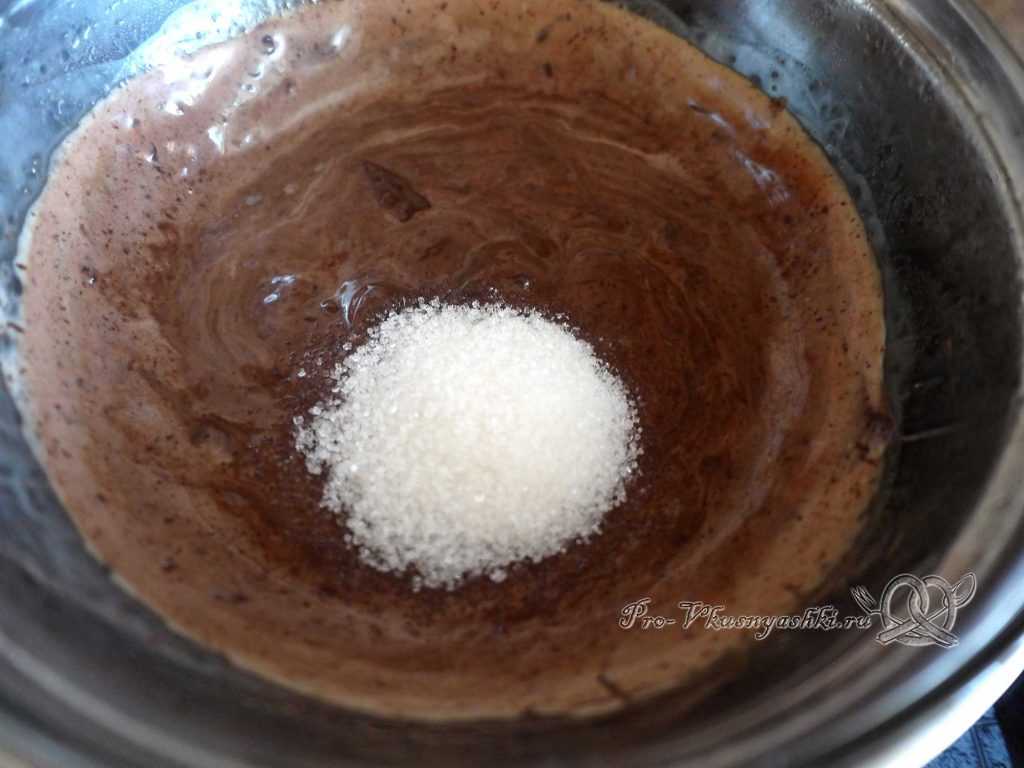 Чтобы снизить горечь темного шоколада, добавляем в него немного сахара (1 ст.л) и, помешивая, нагреваем массу до растворения сыпучего продукта.