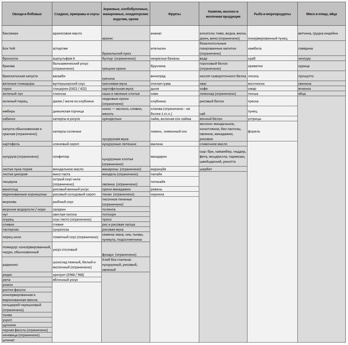 Поскольку программа выпущена в США, список продуктов ориентирован в первую очередь на американский рынок. Но большая часть продуктов из списка все-таки нам знакома. Перечисленные продукты можно употреблять согласно указанным выше ограничениям. Если продукта нет в списке, значит он не разрешен.