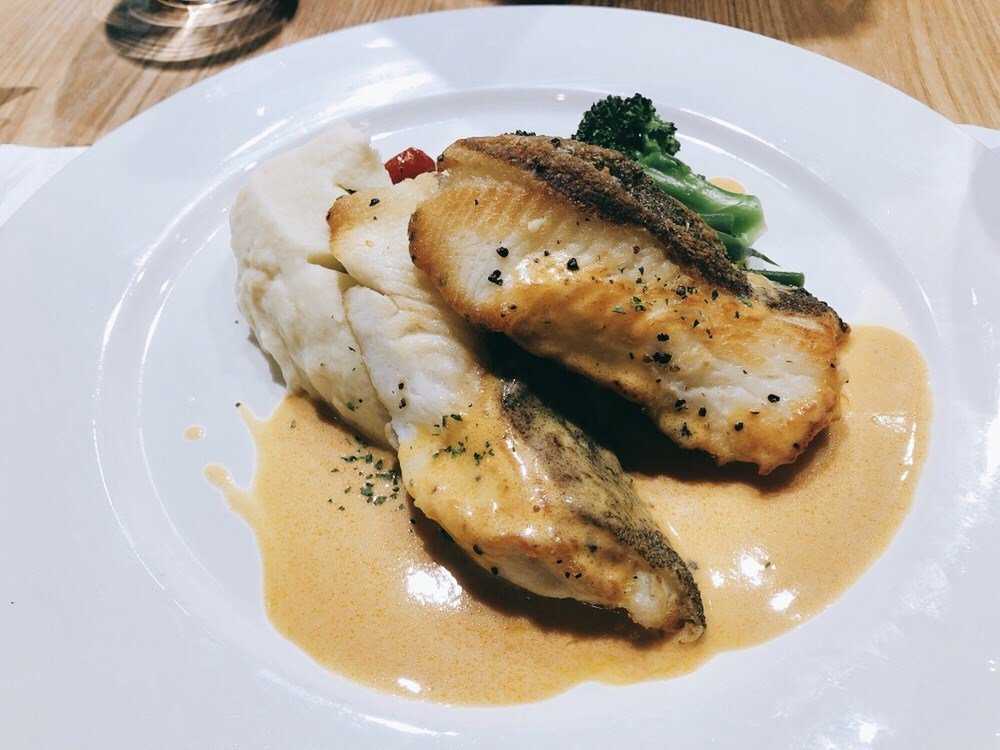 Подают филе морской лежебоки, полив его острым соусом и присыпав зеленью.