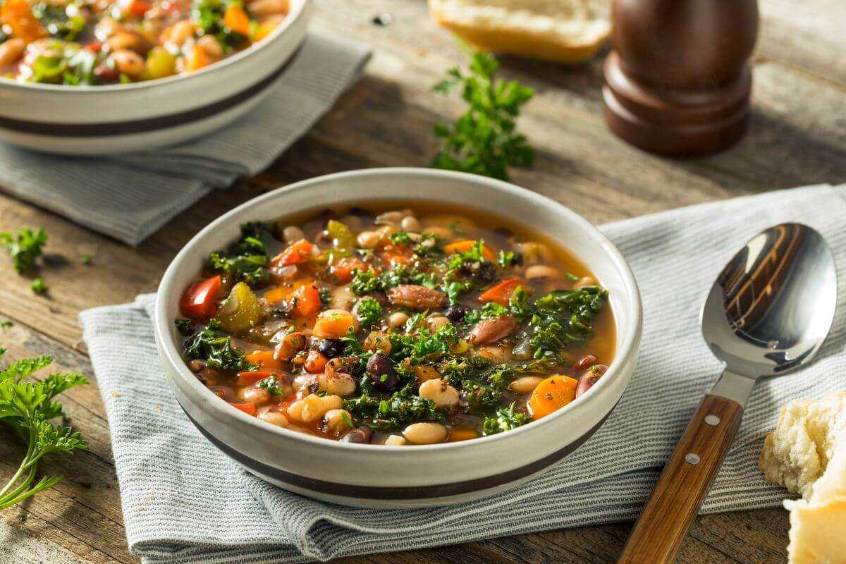 - Поставить суп на плиту и варить на медленном огне. После того, как жидкость закипит, подождать 5 минут и добавить полкило белой или красной фасоли. Еще через 5 минут влить в кастрюлю литр томатного сока или 1 кг измельченных свежих помидоров.