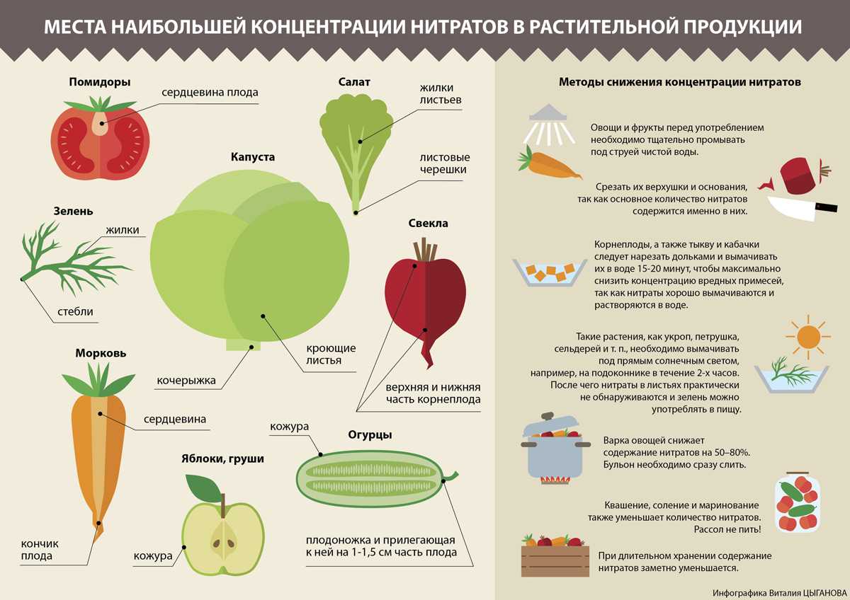 Нитраты являются обязательным продуктом жизнедеятельности многих овощей. Но некоторые из них имеют генетическую способность к избирательному накоплению нитратов. К таким овощам относятся корнеплоды (свекла, редис, морковь), зеленые листовые овощи, кабачки, ранние огурцы, помидоры и капуста. При этом в свекле, моркови и редисе больше контаминантов концентрируется возле «хвостика» и корешка, в капусте — в кочерыжке и верхних листьях, в зеленых листовых овощах — в стеблях и черешках. Меньше нитратов содержится в поздних (грунтовых) плодах.