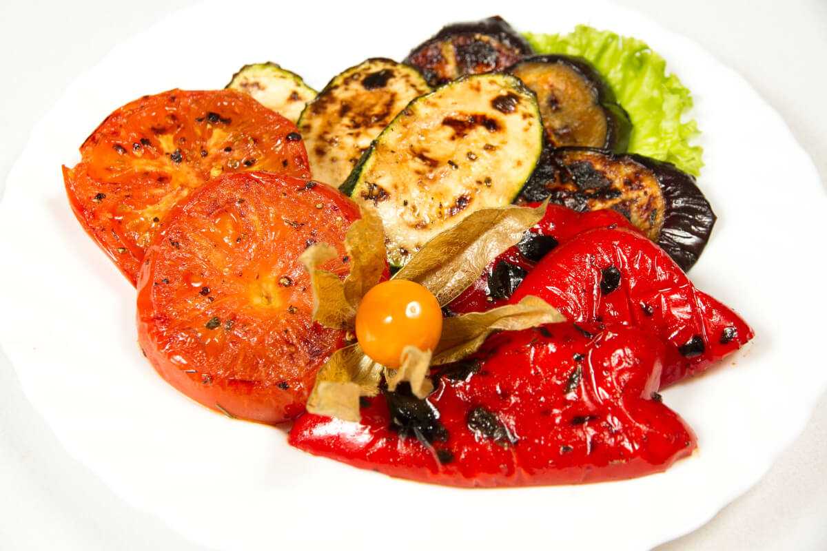 - Ужин. Тушеные овощи (баклажан, кабачок, морковь) с добавлением чеснока и трав. Кусочек курицы или индейки, запеченный в духовке с травами.