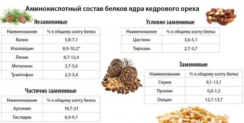 Кедровые белки в отличии других орехов имеют более богатый состав аминокислот, в том числе и незаменимых. В среднем содержание протеинов составляет около 15-17%. Регулярное употребление семян в пищу практически полностью обеспечивает организм в данном питательном продукте.