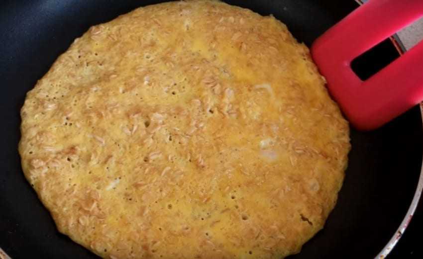 Разогреваем сухую сковороду и выливаем на нее приготовленное «тесто». Если нет уверенности в качестве антипригарного покрытия, предварительно слегка смазываем жарочную поверхность кокосовым или топленым маслом. Распределяем овсяный состав по всей площади. Если смесь получилась густой и растекается с трудом, энергично размазываем ее с помощью ложки или лопатки. В данном примере диаметр сковороды составляет 23 см по низу.