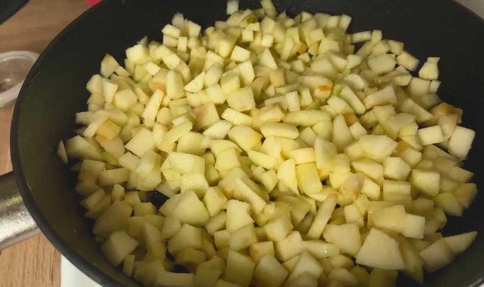 - На сковороде разогреть растительное масло и пожарить яблоки до полного испарения жидкости, охладить.