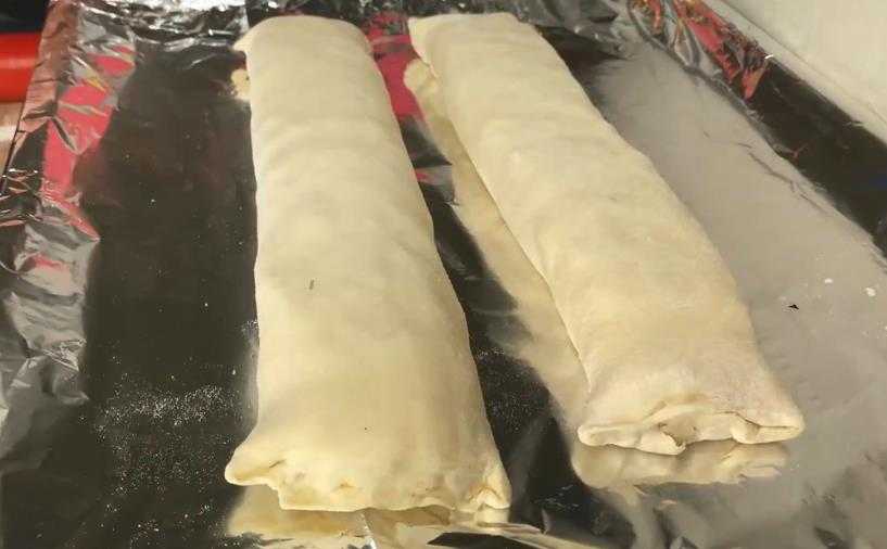 - Противень застилаем бумагой для выпечки. Затем выкладываем два листа теста фило. Сверху выкладываем начинку, заворачиваем в рулет. Из получившегося объема начинки должно получиться три рулета.