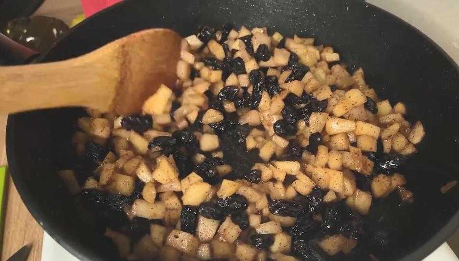 - Жарить на сильном огне, постоянно помешивая. Необходимо, чтобы вся жидкость испарилась, а яблоки стали мягкими. Лаваш с яблоками должны иметь одинаковую степень готовности.