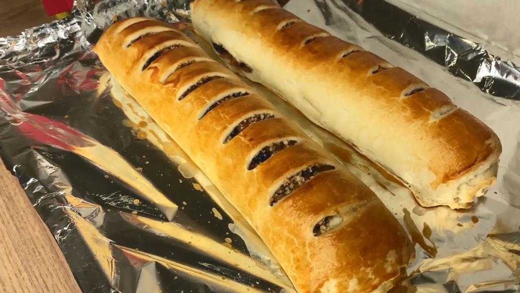 Разложив готовую начинку по всей поверхности раскатанного пласта теста, можно смазать ее взбитым белком с небольшим количеством тростникового сахара. После проделывания всех перечисленных выше довольно нехитрых процедур, с помощью полотенца тесто с начинкой сворачивают рулетом и выпекают в течении 25 минут в духовом шкафу. Рулет можно присыпать сахарной пудрой.