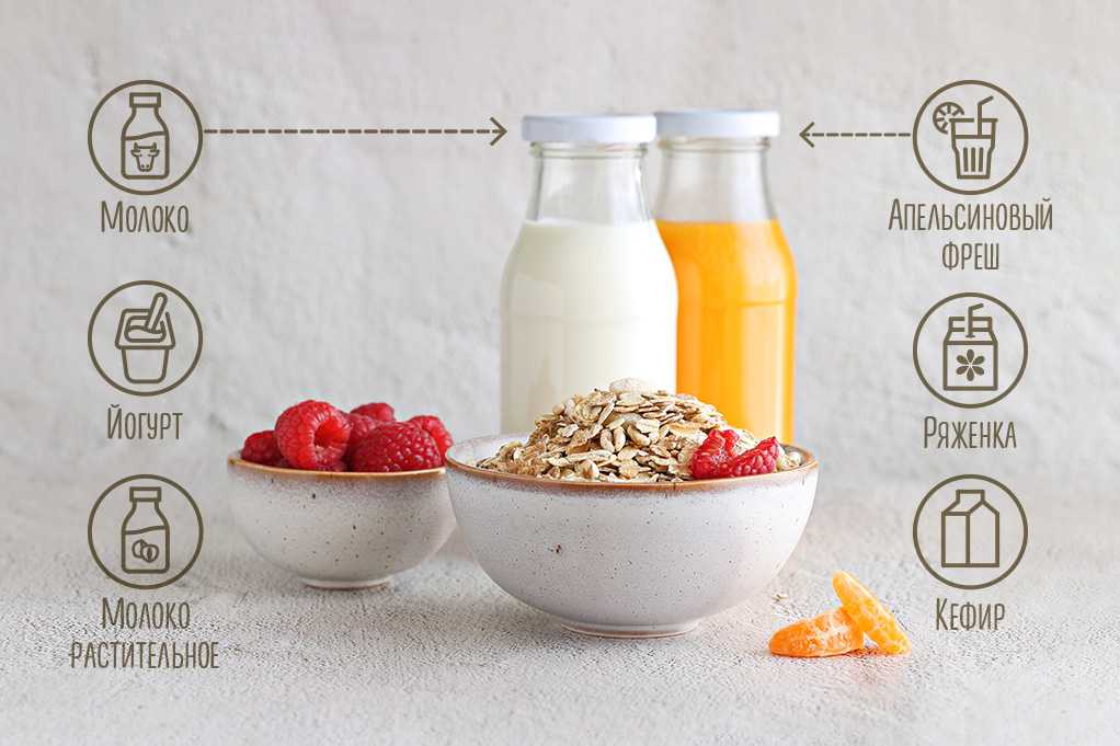 Диетологи советуют заливать сухие завтраки кисломолочными напитками и йогуртом, чтобы продукт постепенно усваивался организмом. Лактозы в кефире, ряженке и йогурте нет благодаря кисломолочным бактериям. Молоко, в составе которого молочный сахар, может стать причиной расстройства слабого желудка.