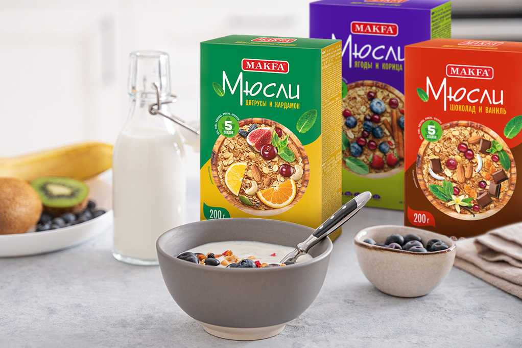 Мюсли MAKFA 5 злаков — вкусное сочетание зерновых хлопьев, кусочков фруктов, ягод, орехов, семян и ароматных пряностей. Это полностью натуральный продукт с простым и честным составом, без гмо, красителей, ароматизаторов и усилителей вкуса.