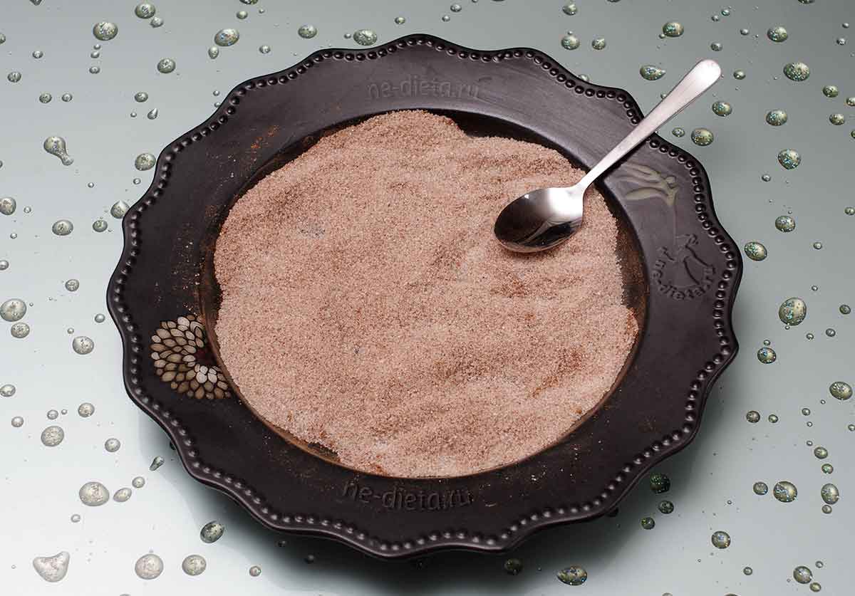 Пока чуррос подсыхают в духовке, подготовьте сахар для обсыпки. Для этого в плотном пакете или просто в глубоком блюде соедините и тщательно смешайте вместе мелкий сахар (или сахарную пудру) и молотую корицу. Также, чтобы слегка уравновесить сладость можете добавить щепотку соли. Кстати, количество корицы подбирайте на свой вкус, можете добавить больше или меньше, а, если вы совсем её не любите, то можете заменить на ваниль.