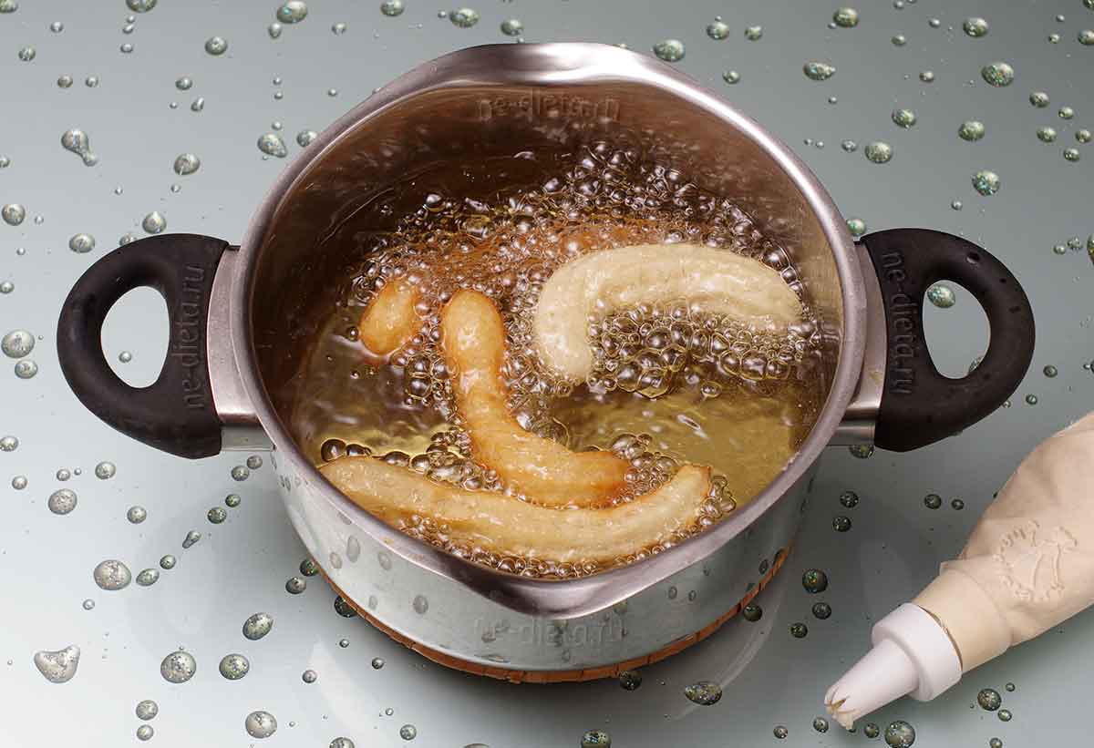 В глубокую кастрюлю с толстым дном влейте растительное масло с высокой температурой дымления. До краев посуды (на 2-3 см) не доливайте, иначе горячие брызги будут разлетаться во все стороны. Разогрейте на среднем огне. Как узнать, что фритюр разогрет достаточно? Опустите деревянную лопатку в горячее масло. Если вокруг собрались пузырьки, значит готово. Выдавите в горячее масло тесто в виде полосочек или в форме подковы. Жарьте до золотистого цвета.