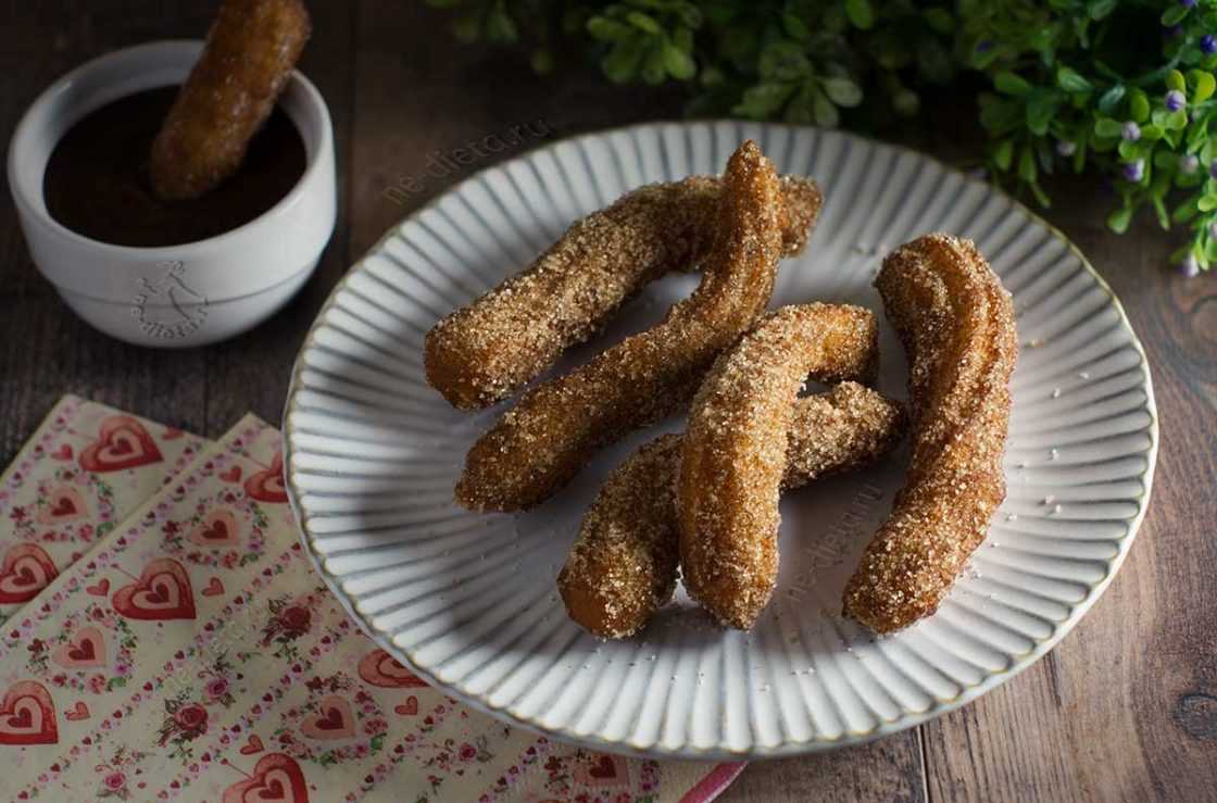 Переложить чуррос на сервировочную тарелку и подавать с шоколадным соусом сразу же.