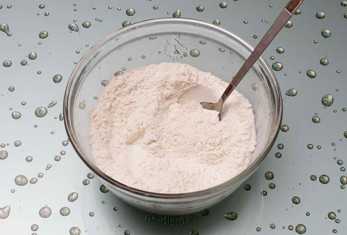 В миску подходящего размера просейте муку, чтобы обогатить ее кислородом. Благодаря этому изделия будут более пышными и воздушными. Мука отличается по своим свойствам, потому на всякий случай просейте ее немного больше, чем указано. Возможно количество потребуется изменить. Будете ориентироваться на желаемую довольно густую консистенцию.