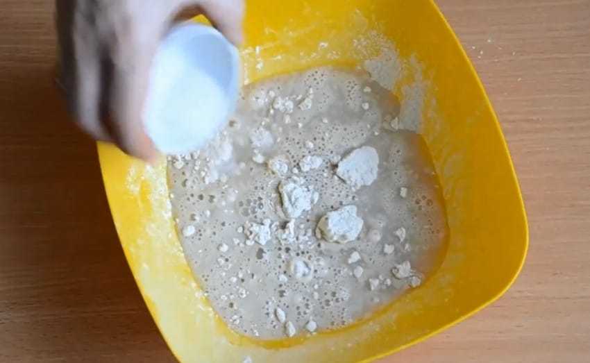 - Муку разделить на 3 части. Одну треть просеять в миску, добавить сухие дрожжи, сахар или мед, перемешать и влить 350 мл теплой воды. Еще раз размешать и накрыть салфеткой. Оставить в тепле на 20 минут. Масса должна увеличиться.