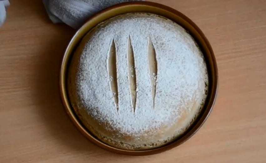 - Переложить тесто в смазанную маслом форму, накрыть салфеткой и оставить на 15 минут, затем выпекать 25–35 минут при температуре 220 градусов.