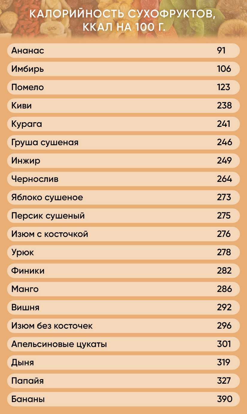 О каких бы видах сухофруктов ни шла речь, имейте в виду, что 100 грамм свежих и 100 грамм высушенных фруктов не одно и то же. Понять, сколько сухофруктов можно есть в день тем, кто не хочет толстеть, поможет таблица калорийности.