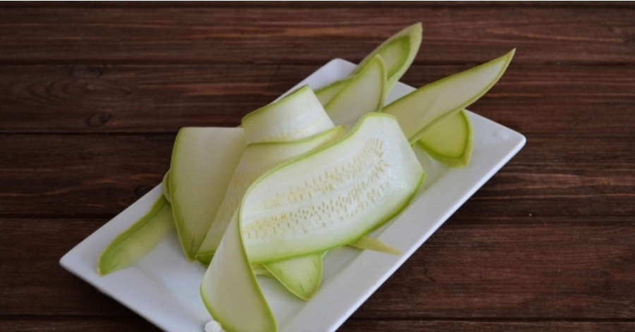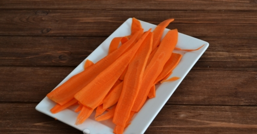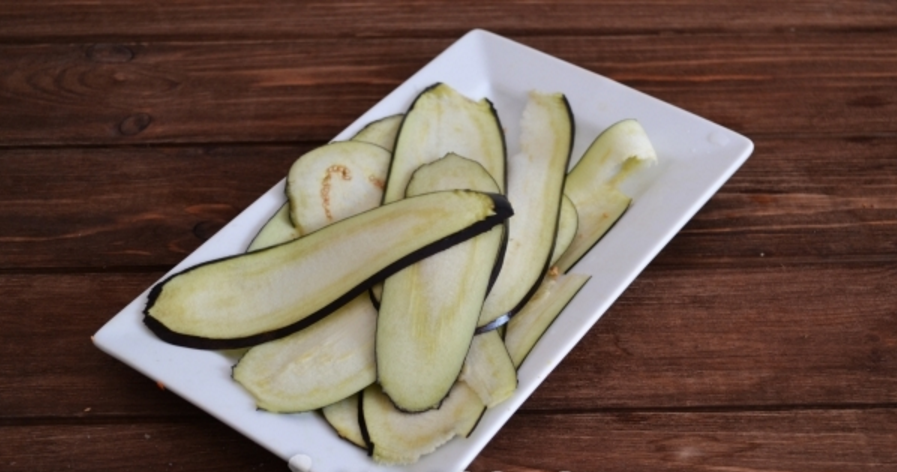 Баклажаны порезать слайсами. Для этого удобно использовать овощечистку. Посолить и оставить на 30 мин.
