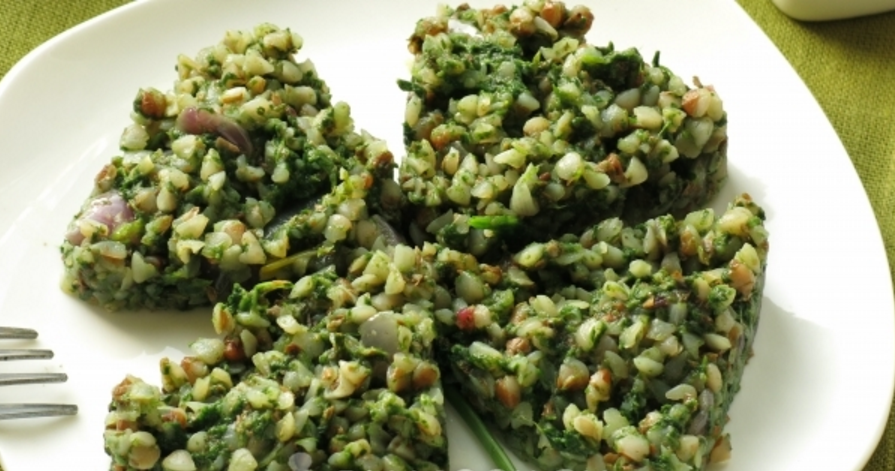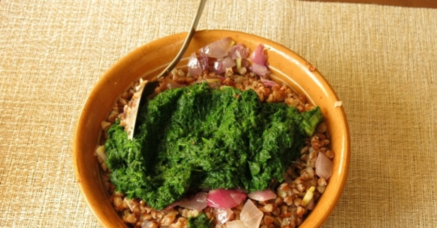 Готовую гречневую кашу смешать с жареным луком и пюре из шпината. Подаем.