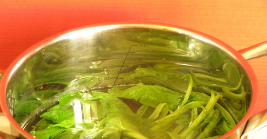 Шпинат отварить в течение 5 мин. Охладить под струей холодной воды.
