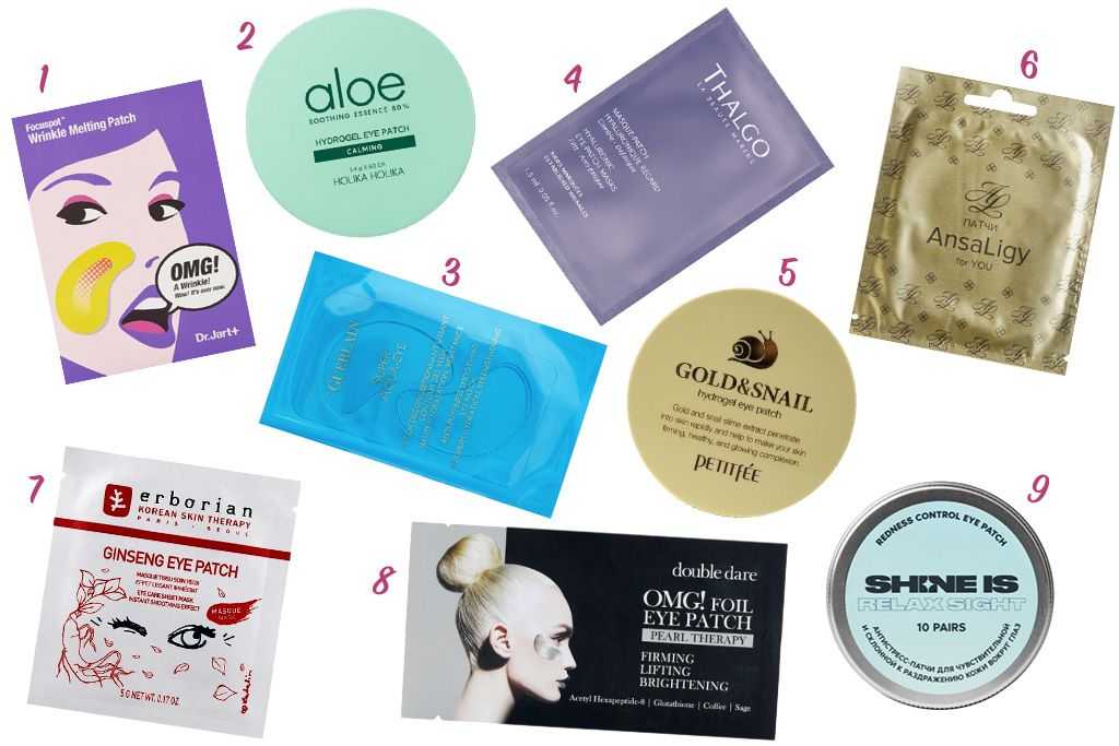 1 – тающие патчи с эффектом лифтинга Dr.Jart+; 2 – гидрогелевые патчи с алоэ Holika Holika; 3 – разглаживающие патчи против признаков старения Guerlain; 4 – гиалуроновая маска-патч Thalgo; 5 – гидрогелевые патчи Petitfee; 6 – лифтинг-патчи для глаз с гранулами янтаря и сывороткой Ansaligy; 7 – тканевые патчи с женьшенем Erborian; 8 – патчи с кофеином OMG! Double Dare; 9 – тканевые антистресс-патчи для чувствительной кожи Shine is