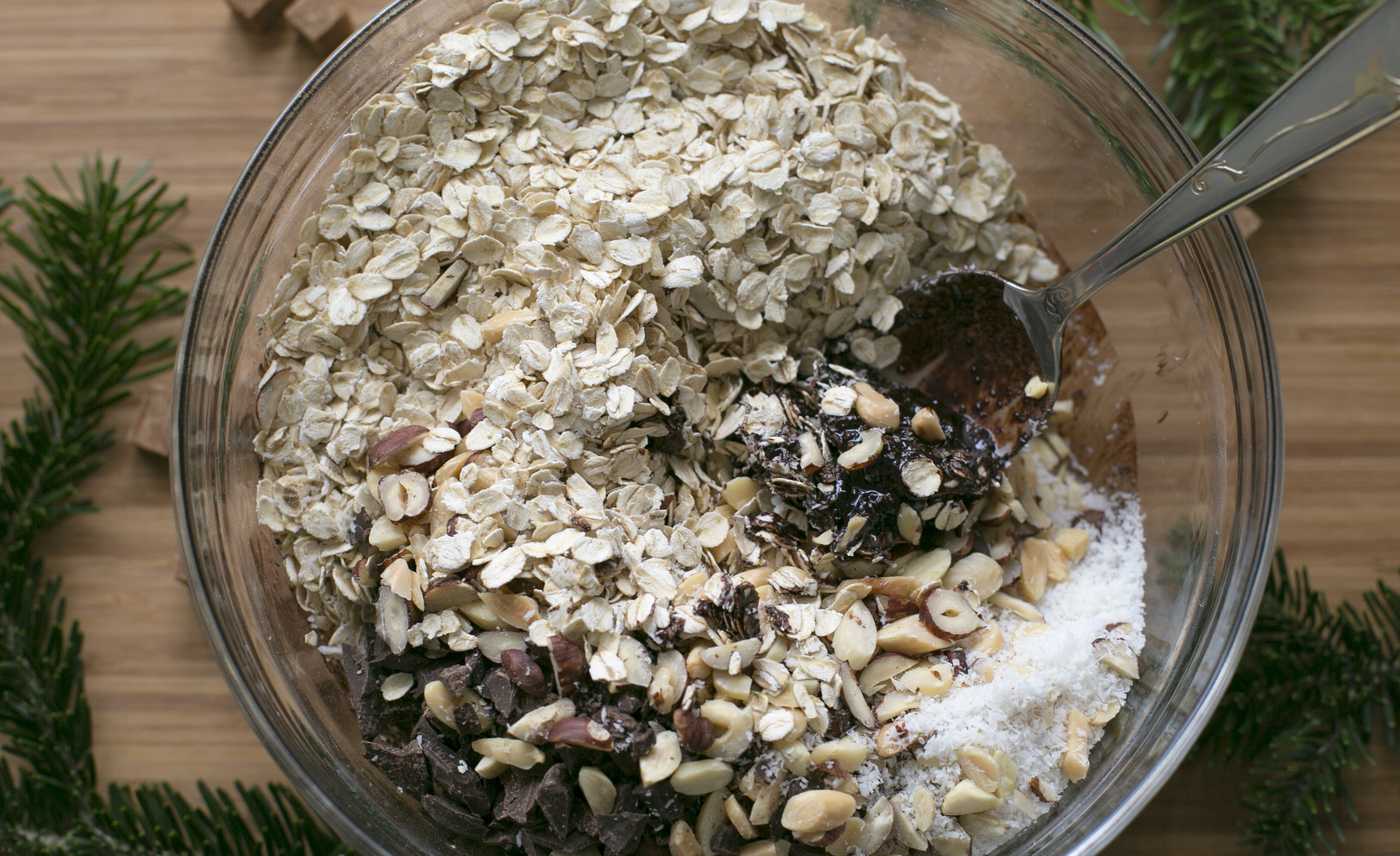 Когда масса станет однородной, засыпаем в нее овсяные хлопья, миндаль с фундуком, кокосовую стружку и шоколадную крошку.
