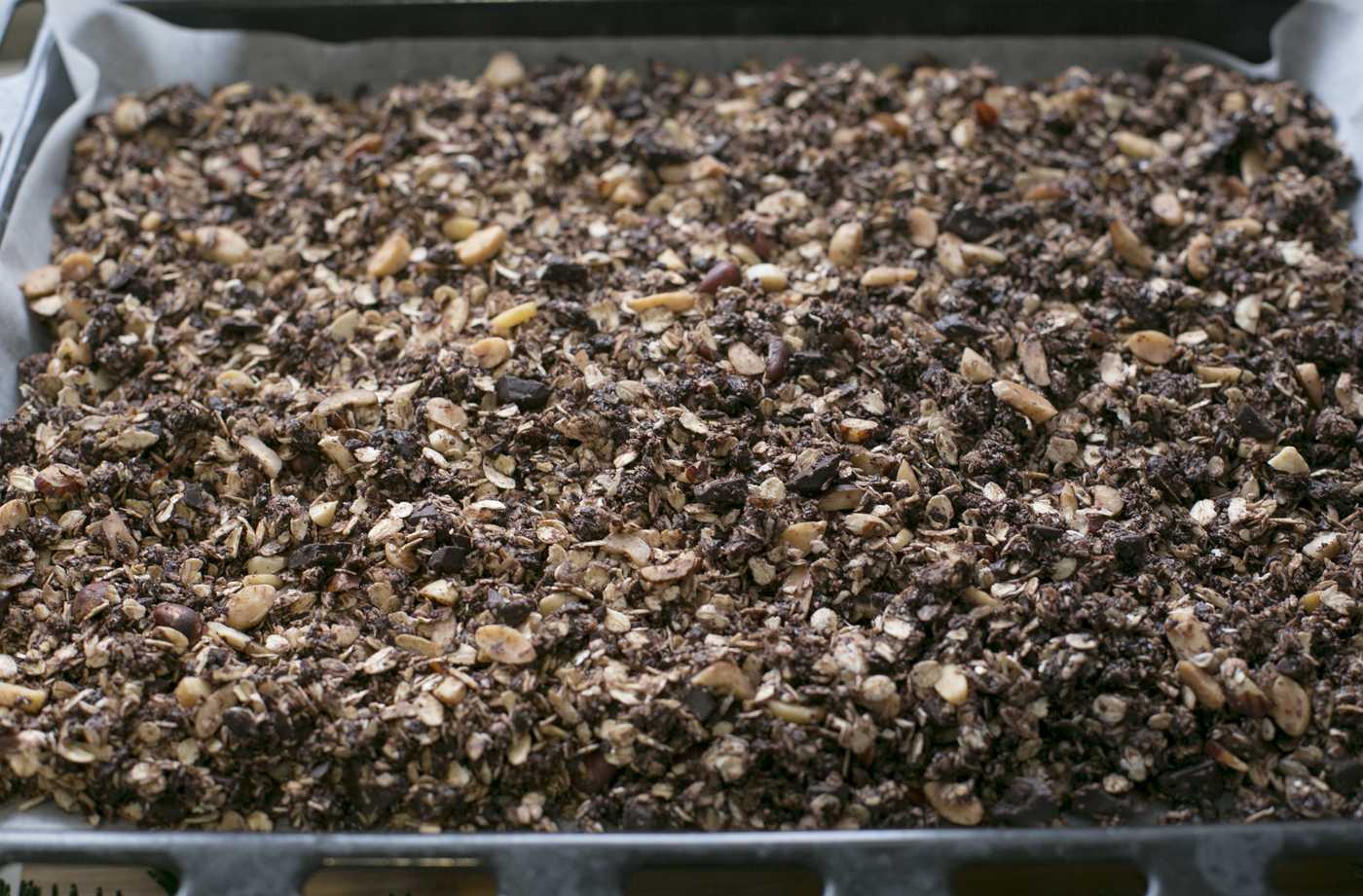 - Противень накрыть пергаментом и сверху выложить гранолу.