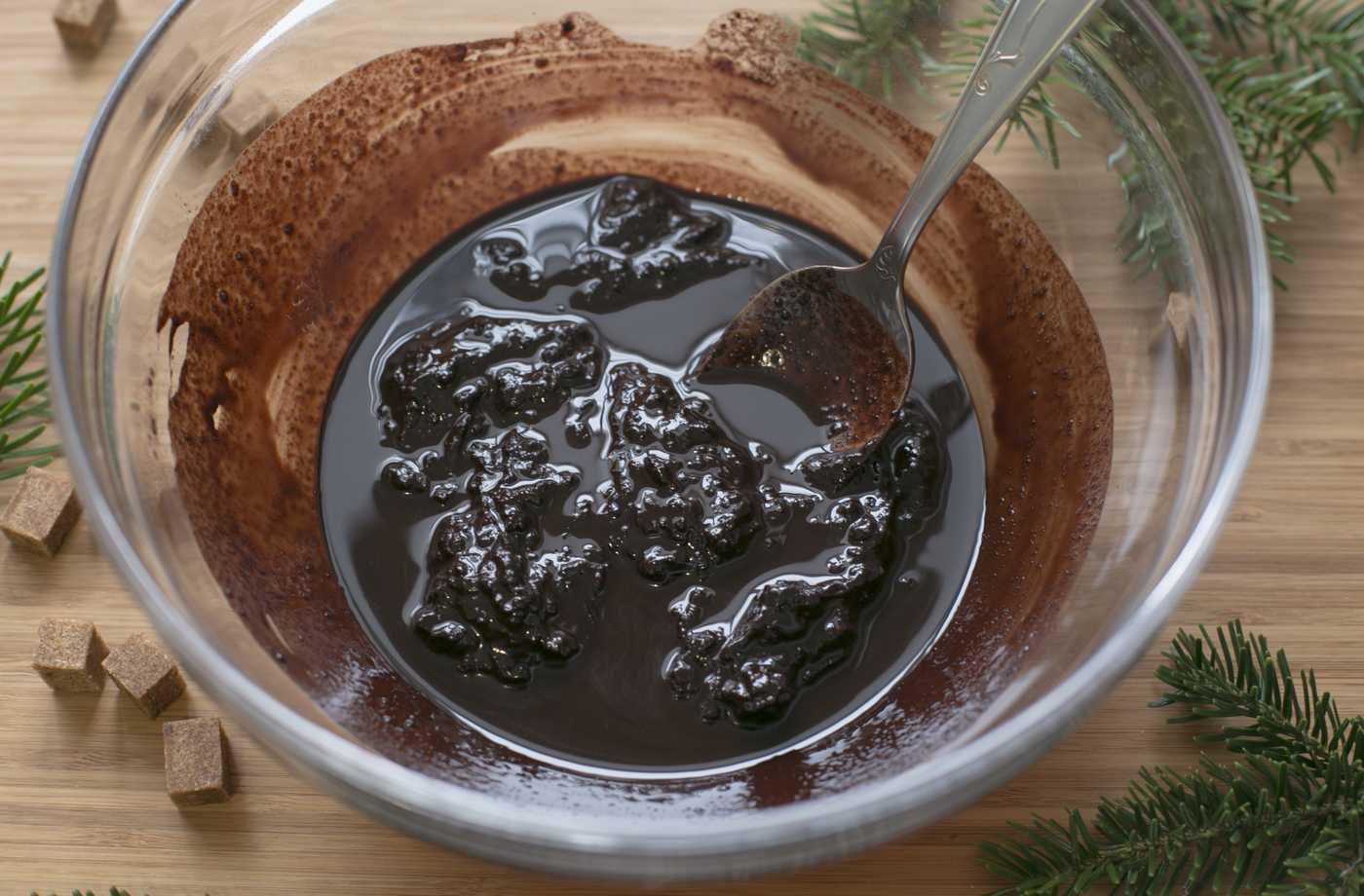Отмеряем 3 ст.л натурального мёда, 3 ст.л коричневого сахара и 4 ст.л темного какао порошка.