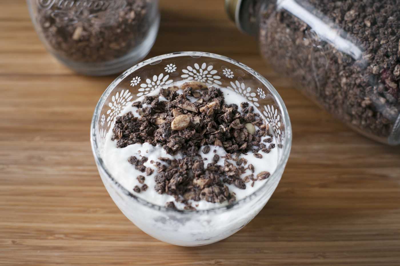 По-истине королевский завтрак для настоящих ценителей шоколада. Каждый день кушать это слишком, но иногда что бы себя порадовать — идеальный вариант. Гранола получается с очень насыщенным вкусом и ароматом. Ее можно смешать с соевым напитком или любым другим «молоком». Мне нравится такое сочетание: гранола + soya drink + кукурузные хлопья.