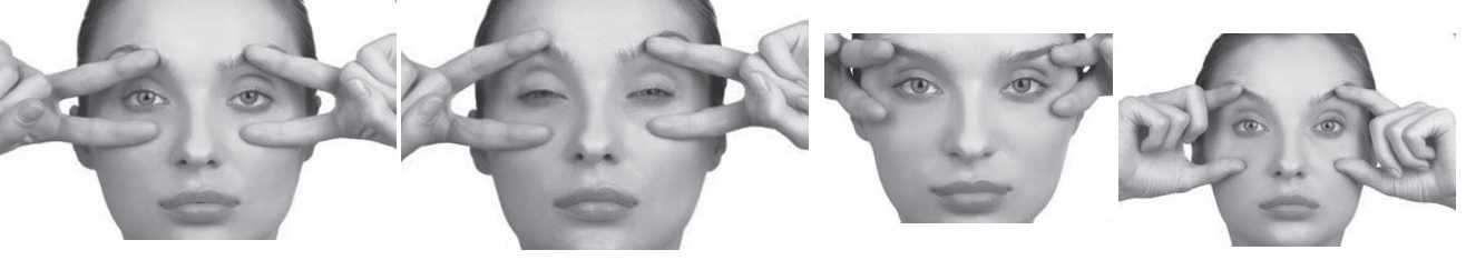 - Указательные пальцы прижать к внешним уголкам глаза, а средние – к внутренним, широко открыть глаза, высоко подняв брови и чувствуя напряжение верхнего века.