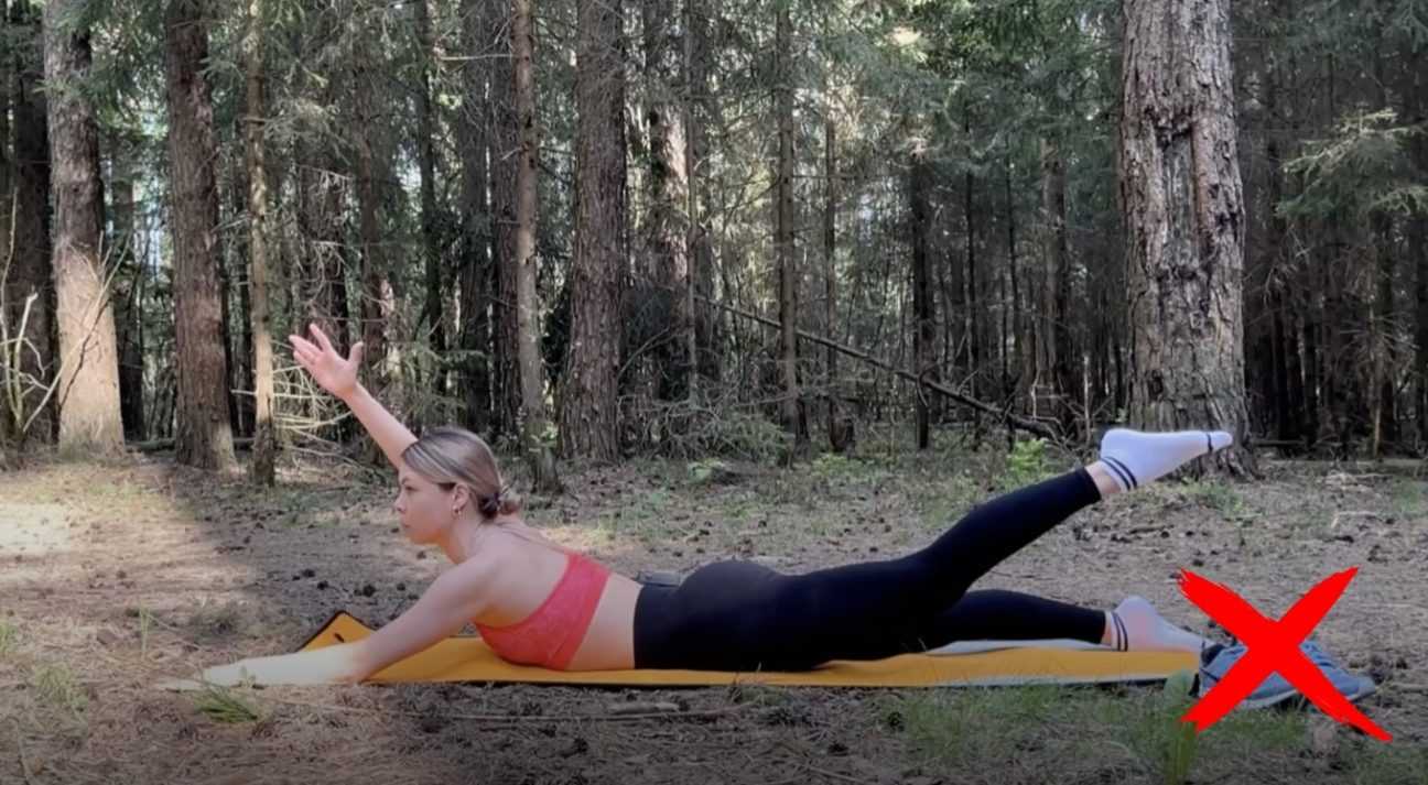Рука и нога подняты слишком высоко. Из-за этого поясница сильно прогибается. Так делать нельзя даже людям со здоровой спиной