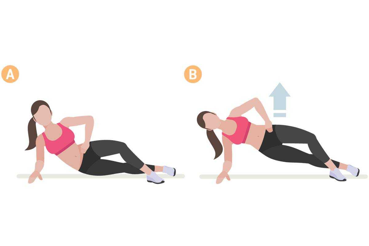 Упражнение для развития боковых мышц корпуса и мускулатуры внешней поверхности бедра. Исходное положение: лежа на боку, опираясь на согнутую в локте руку, ноги скрещены. На выдохе, напрягая мышцы пресса, приподнимите корпус вверх. Выполните 12-15 раз для каждой стороны тела.