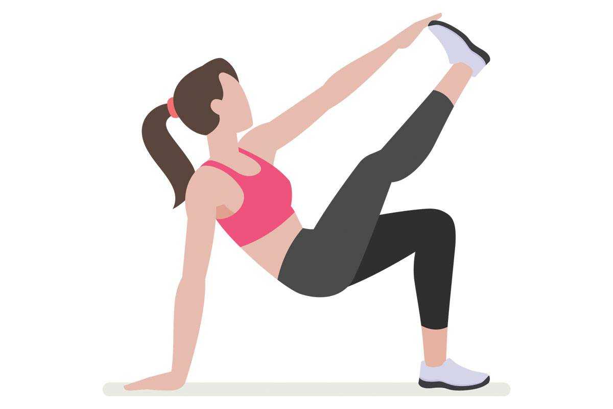 Одно из наиболее сложных упражнений комплекса тренировок для похудения. Исходное положение — сидя, руки за спиной на полу, согнутые в коленях ноги перед собой. Поднимите таз вверх, одновременно вытягивая левую ногу вперед — и тянясь к ней правой рукой. Перемените руку и ногу. Выполните 12-15 раз.