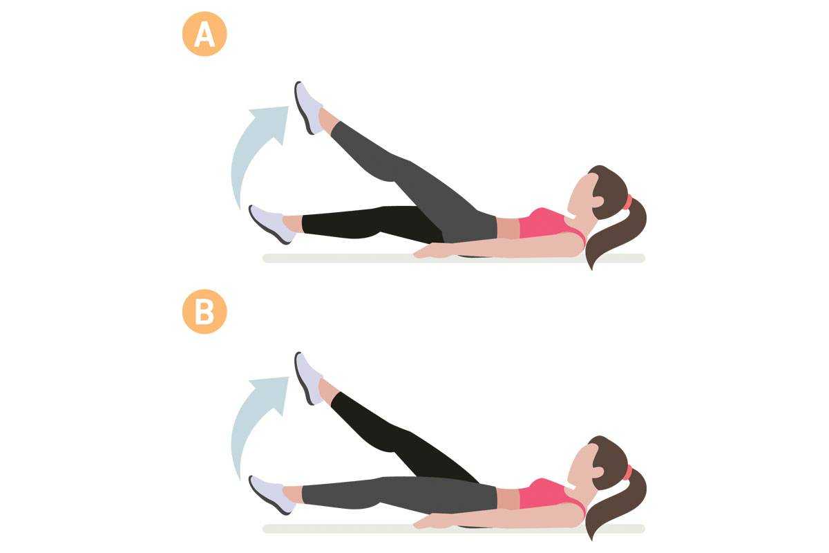 Исходное положение: лежа на спине, руки вытянуты вдоль тела. Сперва, за счет вовлечения мышц живота в работу, поднимите обе ноги вверх — затем, сохраняя пресс напряженным, выполняйте поочередные движения вверх-вниз. Выполните 8-12 повторений упражнения на каждую ногу.
