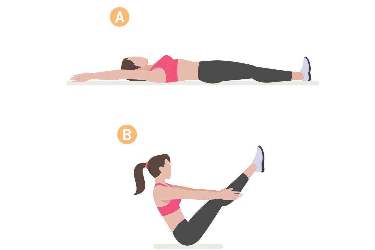 Упражнение для похудения продвинутого уровня сложности — требует хорошей растяжки мышц задней поверхности бедер. Из положения лежа, при вытянутых руках и ногах необходимо поднять корпус вверх — сохраняя спину прямой. В верхней точке задержитесь 2-5 сек. Выполните 8-12 повторений.