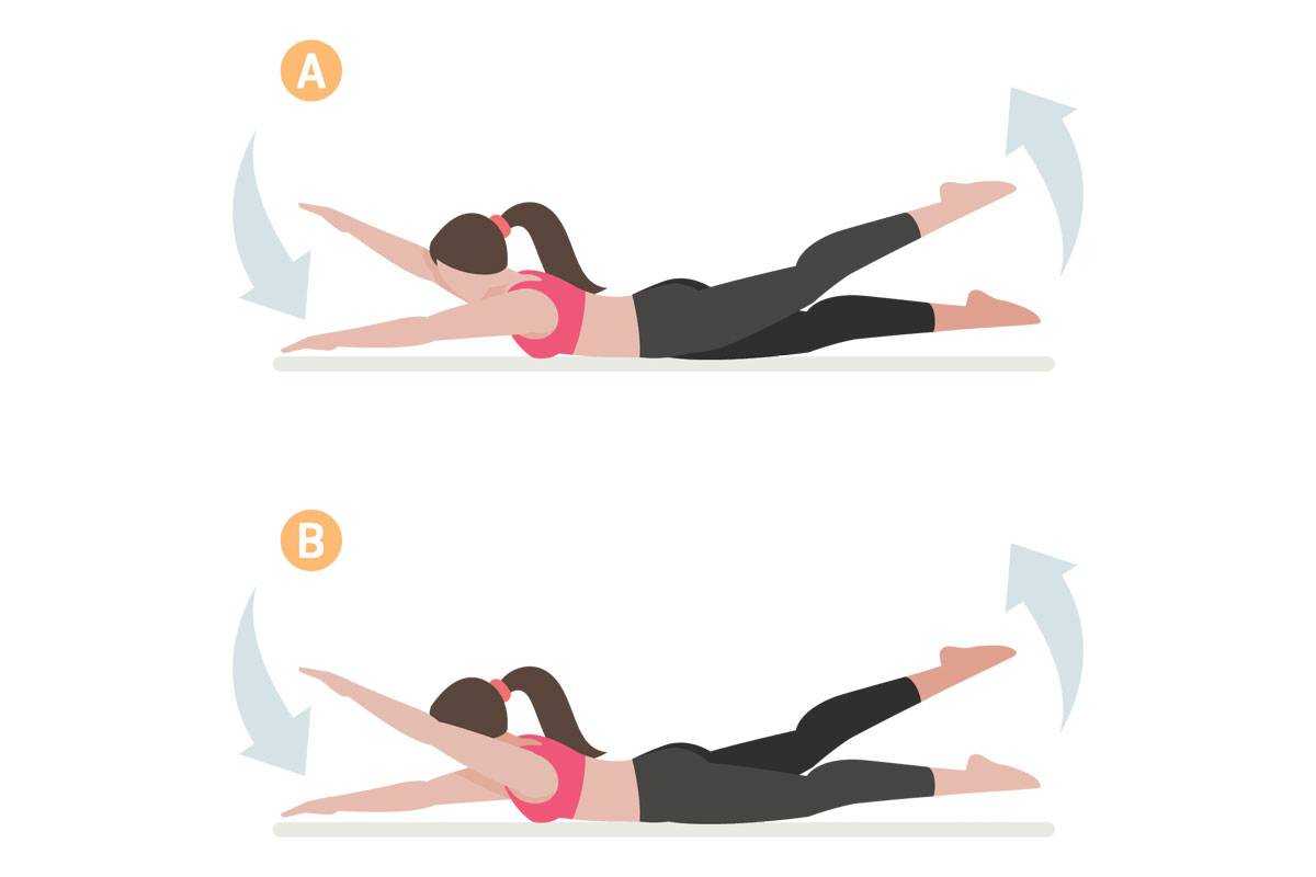 Лежа на животе, вытяните руки и ноги — после чего начинайте поочередные движения ими, чередуя левую руку и правую ногу и наоборот. Следите за тем, чтобы шея не заламывалась, а взгляд был направлен вниз. Выполняйте упражнение от 20 до 60 секунд.