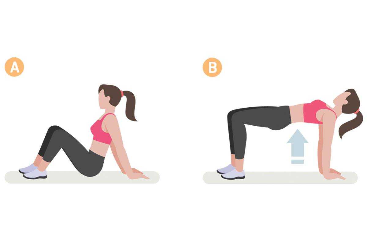 Исходное положение: сидя на коврике, руки за спиной, согнутые в коленях ноги перед собой. За счет вовлечения мышц ягодиц поднимите таз вверх — затем задержитесь не 1-2 сек, как можно сильнее сожмите попу, после чего опустите корпус вниз. Повторите 8-12 повторений упражнения.