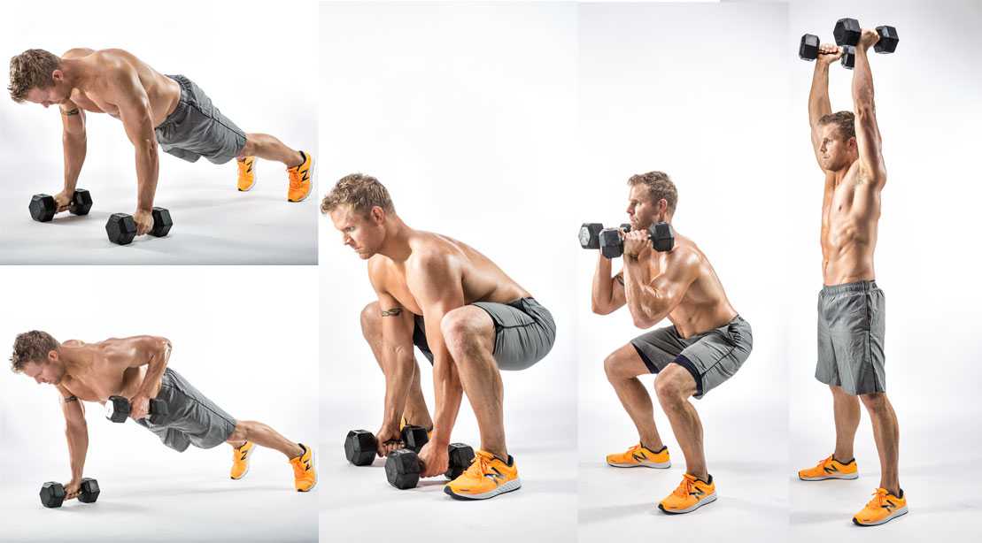 Итак, для «Менмейкера» потребуется пара гантелей среднего веса, не 2 кг, а такого, который вы бы стали поднимать на бицепс на 15-20 повторений. Нужно встать прямо с гантелями в руках, и опустить их на пол, отводя таз назад и чуть сгибая колени, как в румынской тяге. Затем расположить веса на ширине плеч, от отпрыгнуть в планку. Отжаться до касания грудной клеткой пола, и остаться в упоре. Выполнить по 1 тяге с каждой руки, приводя гантель к грудной клетке. Затем прыжком довести ноги к рукам, и, собрав спину, выполнить тягу до уровня карманов. Оттуда полтолкнуть вес ногами (легкий подсед и быстрое разгибание в коленном суставе) до уровня плеч. И, наконец, выжать или вытолкнуть гантели вверх, и повторить все в обратном порядке.