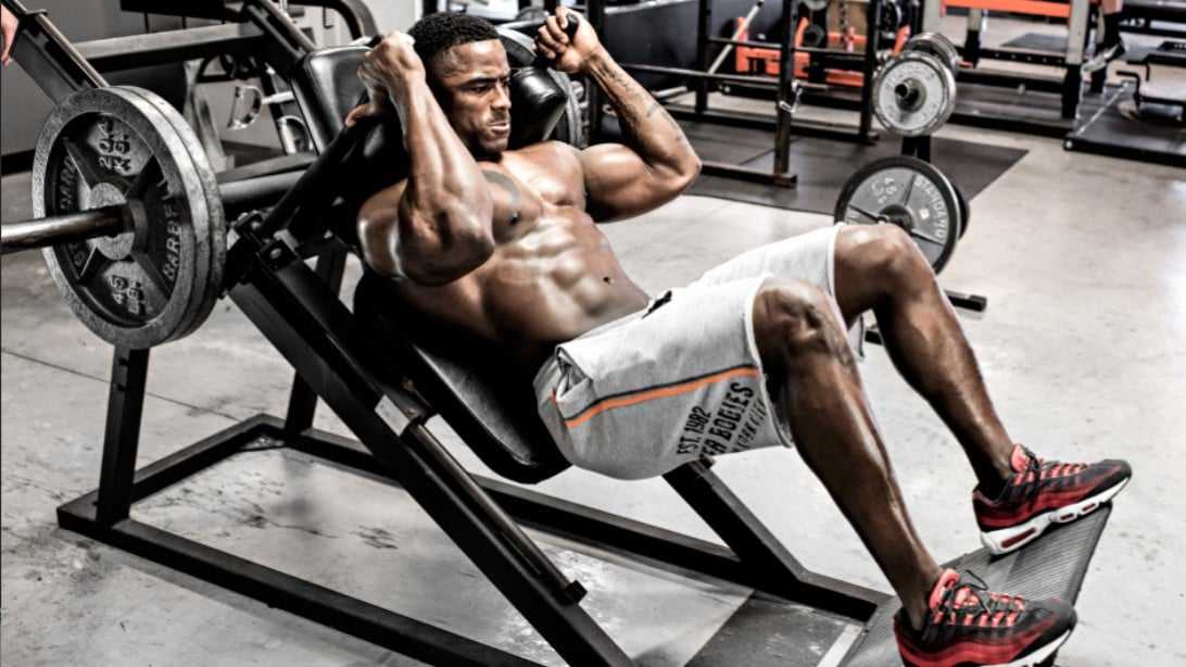 Атлет выжимает ногами платформу с установленным весом в специальном тренажере. За счет фиксации спины снижается опасная нагрузка на поясничный отдел.