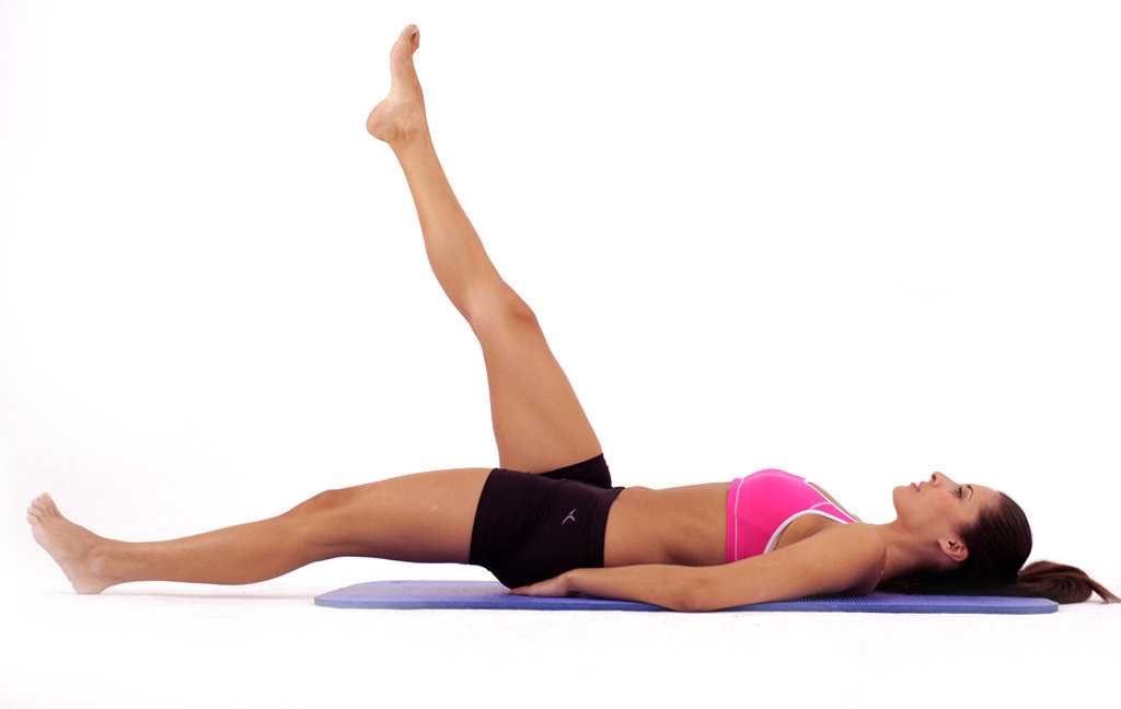 - Затем поднимаем обе ноги максимально вверх с одновременным напряжением брюшной области. Нижняя часть спины должна оставаться неподвижной на полу.